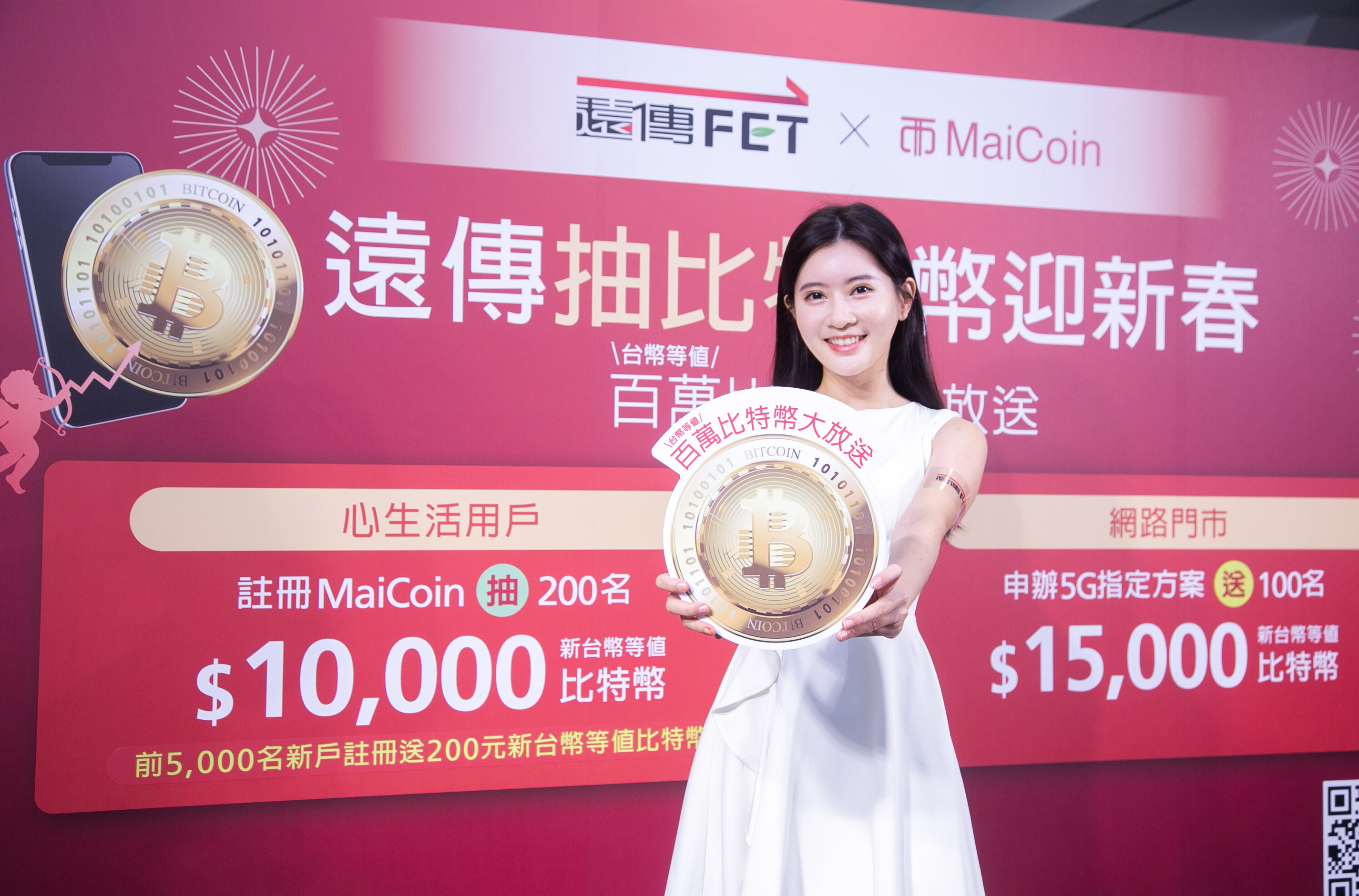 遠傳電信今(21)日宣布與台灣交易量最大的虛擬貨幣平台「MaiCoin」攜手合作,開啟理財新篇章!遠傳去年宣布策略投資「MaiCoin」,為電信服務與虛擬貨幣的跨領域合作揭開序幕,今日更進一步結盟,聯手推出「遠傳抽比特 幣迎新春」活動,為用戶帶來全新的理財體驗。即日起只要透過「遠傳心生活」App申請註冊MaiCoin帳戶,並完成驗證;或透過遠傳網路門市申辦5G指定專案,就有機會獲得新春大紅包,將送出總計約450萬台幣的比特幣大禮,總價值超過1顆比特幣,讓用戶開春就有好彩頭!